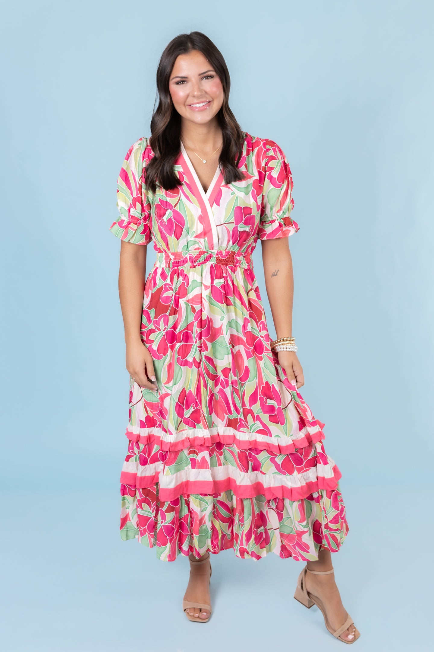 Unleash your inner retro fashionista with The Retro Midi Dress! Featuring a vibrant multicolor floral print, this dress will make you stand out in any occasion. It also boasts a flattering V-neckline, an elastic waist for the perfect fit, and cute ruffle cuffs on the short puff sleeves. And let's not forget the tiered skirt with contrast bands that add a fun twist to this already unique dress. Upgrade your wardrobe and turn heads wherever you go!