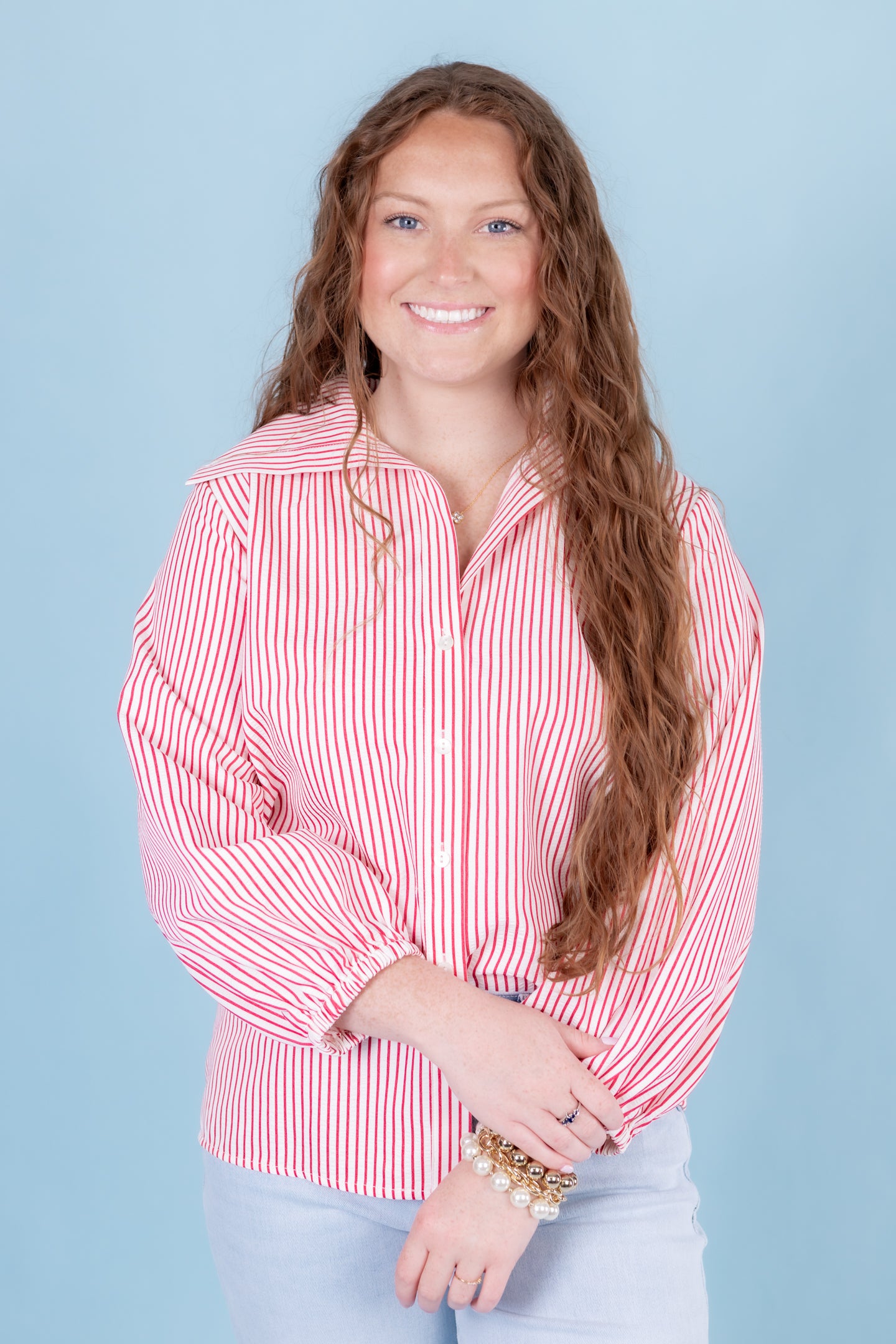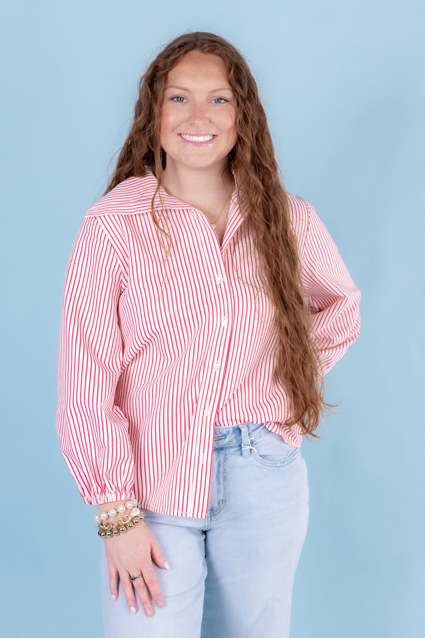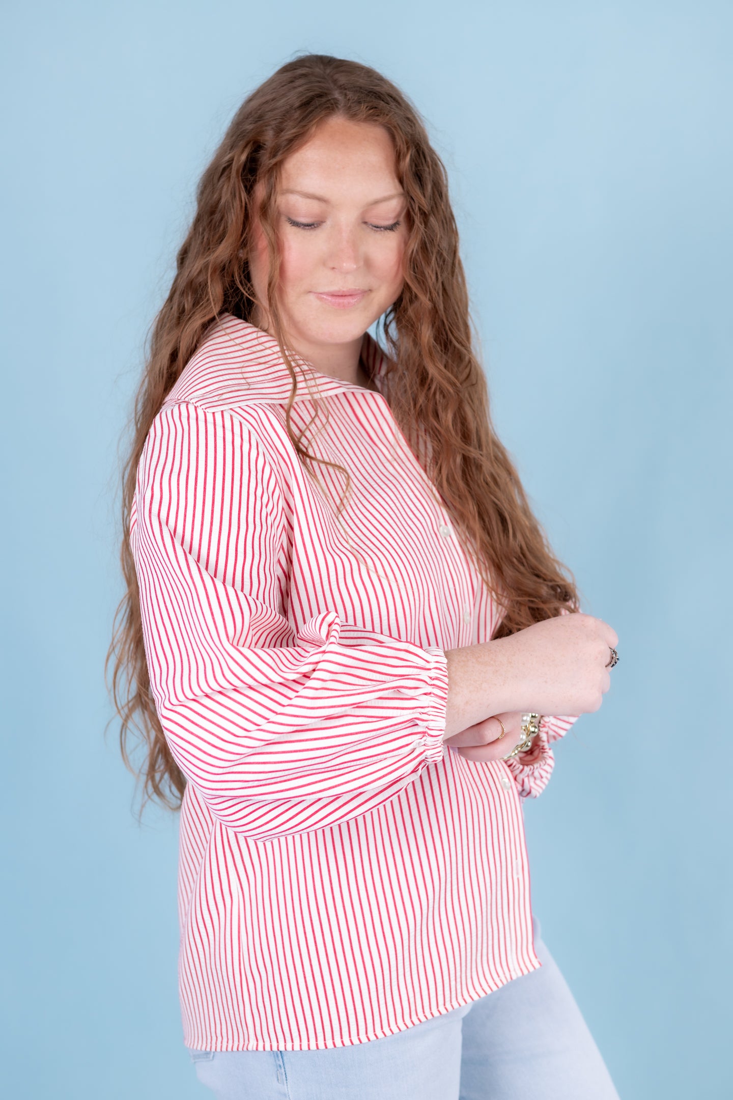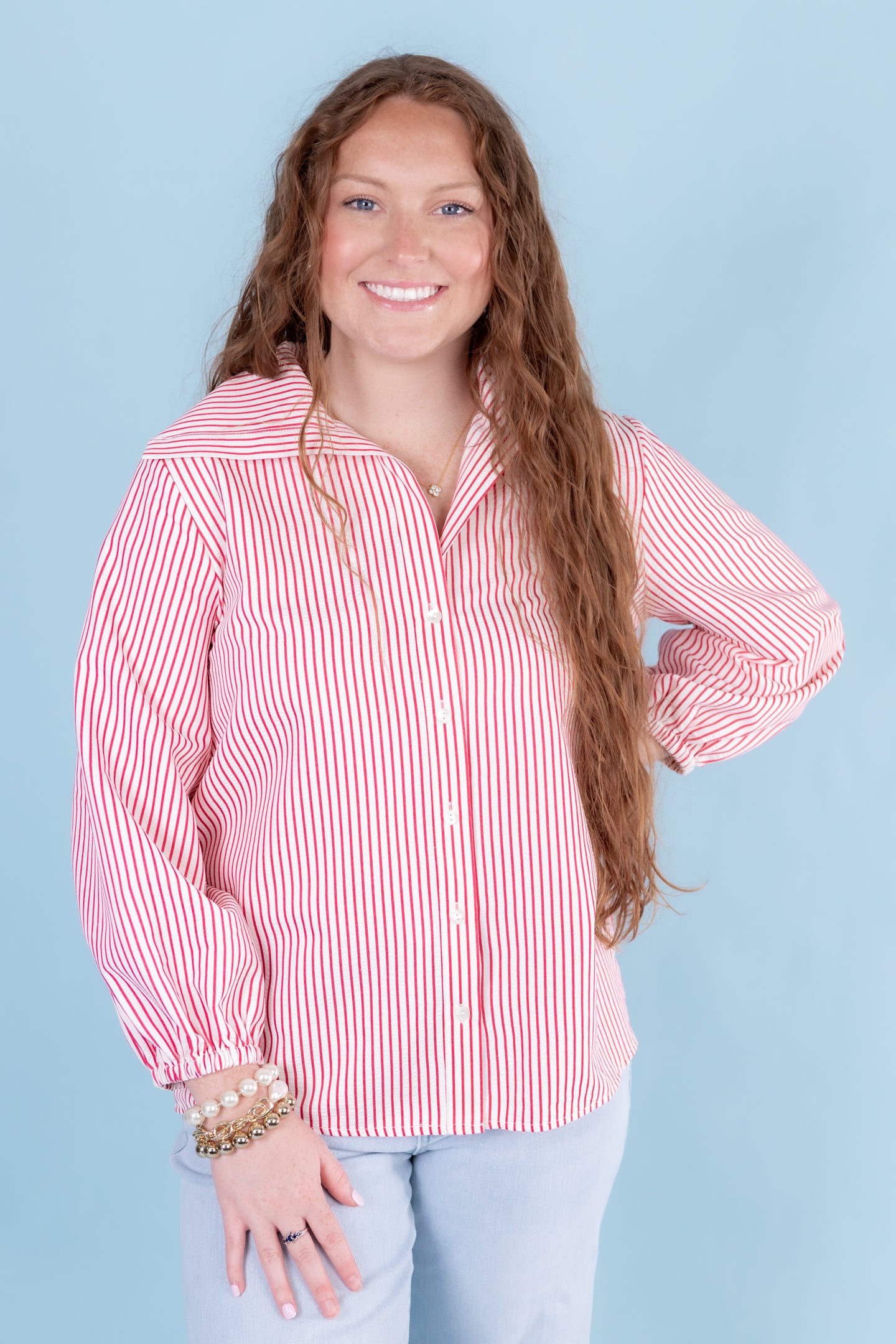Get ready to turn heads in The Riverdale Top. This striped top features a wide collar and front button closure, adding a touch of sophistication to your wardrobe. The elasticated sleeve band opening provides comfort and versatility, while the lightweight woven fabric keeps you cool and stylish. Perfect for any occasion, this top will have you feeling confident and chic.