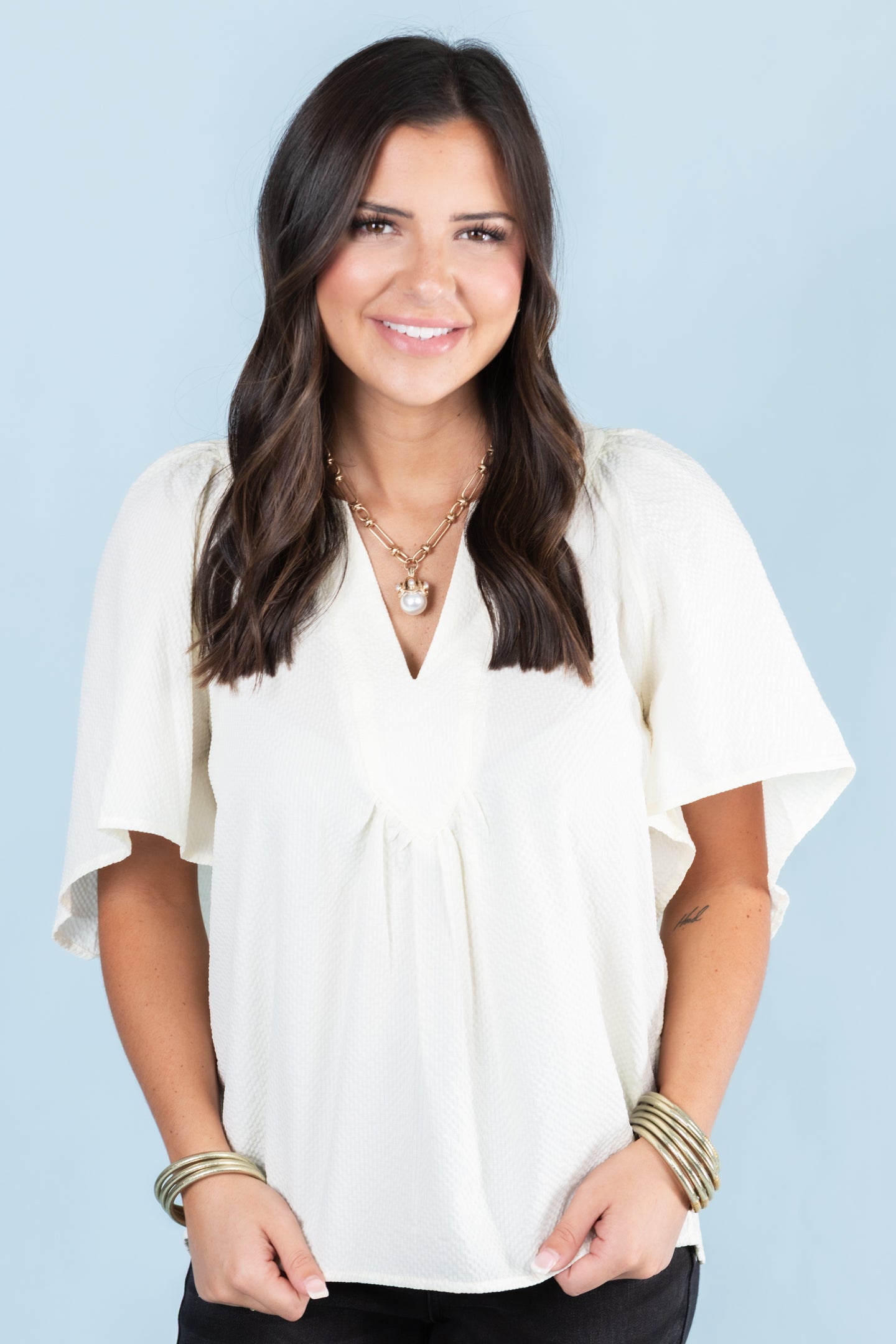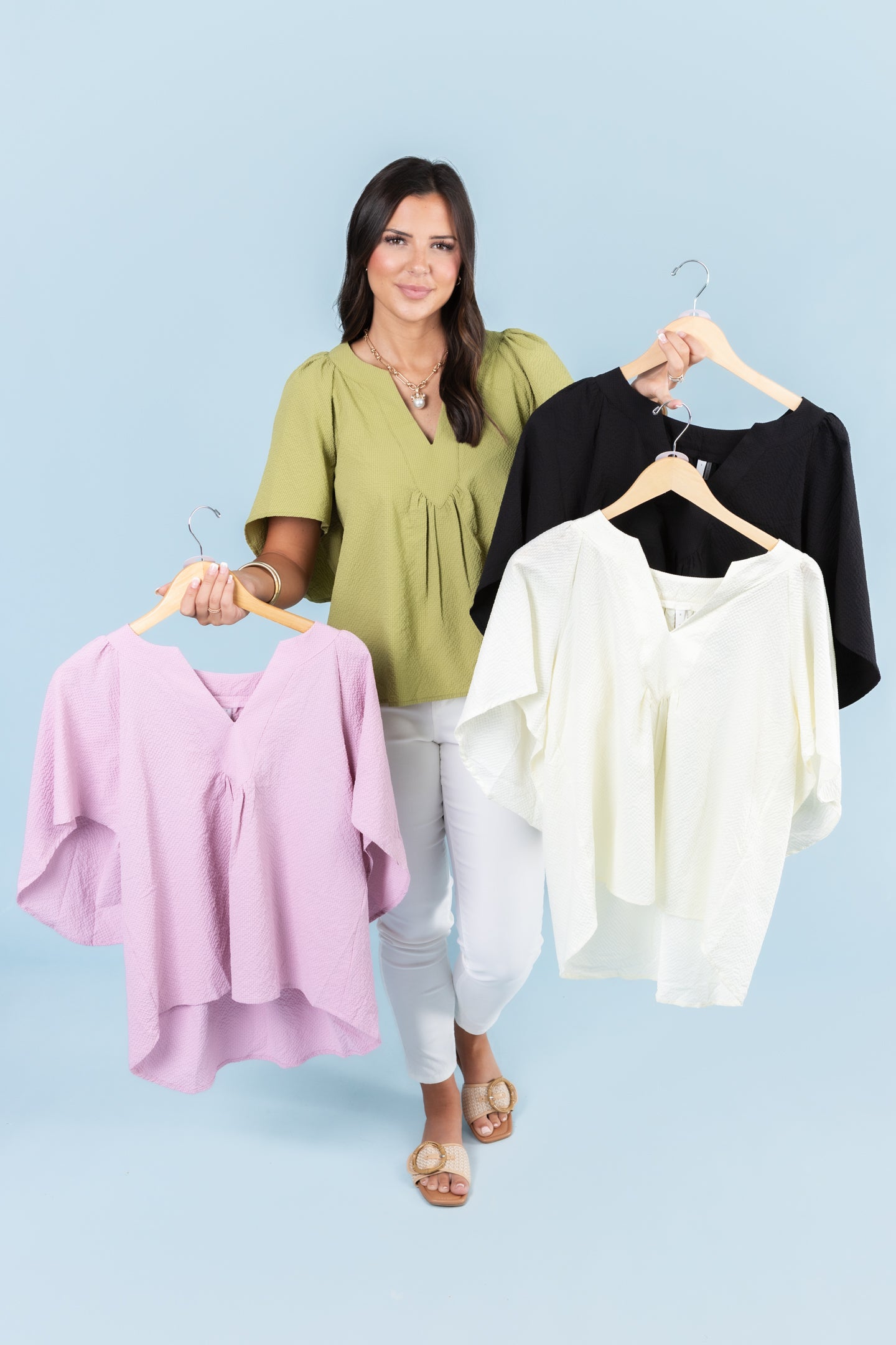 The Stacey Blouse features a flattering V-neck placket and a textured fabric for a stylish, versatile top. Elevate your wardrobe with this must-have piece!