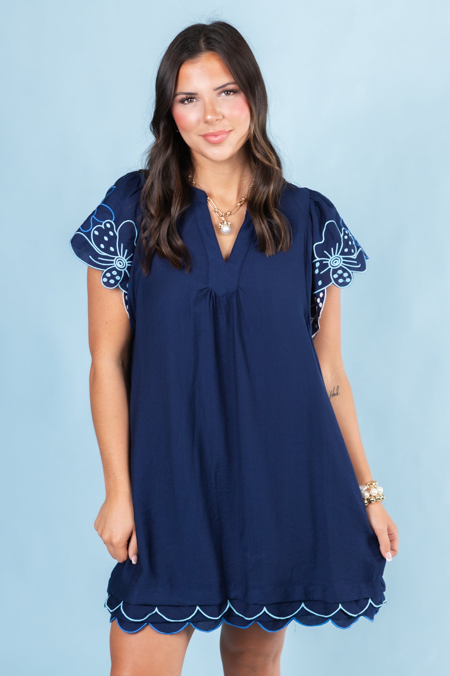 The Trinity Midi Dress offers a relaxed tunic fit and features flutter sleeves with delicate floral embroidery. The V-neck and scalloped contrast detailing add a touch of elegance, while the lightweight and breathable fabric ensures all-day comfort. Elevate your wardrobe with this versatile and stylish dress!
